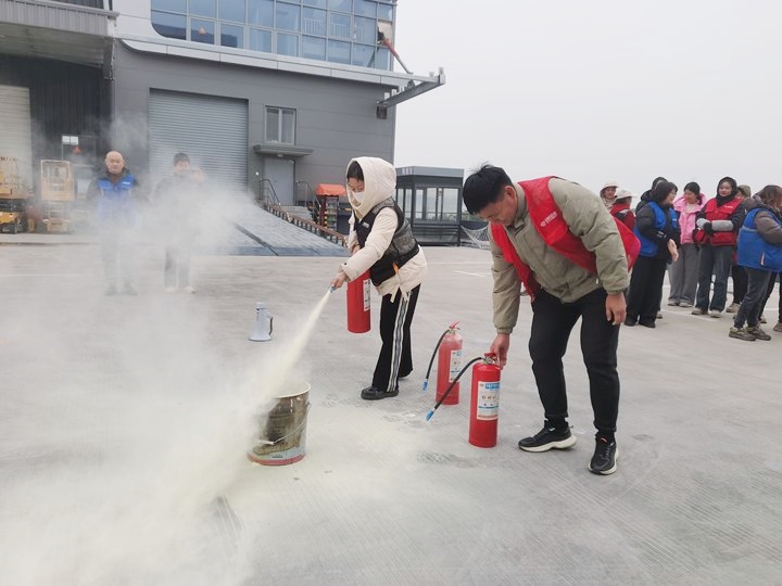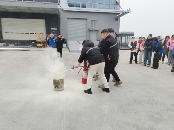 疏散演練結(jié)束后,滅火器的正確使用培訓(xùn)成為重頭戲。在各倉的演練現(xiàn)場,指導(dǎo)員潘宏浩詳細(xì)講解了滅火器操作要領(lǐng)。面對熊熊燃燒的模擬火盆,員工們躍躍欲試,紛紛拿起滅火器,按照 “一提、二拔、三握、四壓” 的口訣,對準(zhǔn)火焰根部進(jìn)行噴射操作。