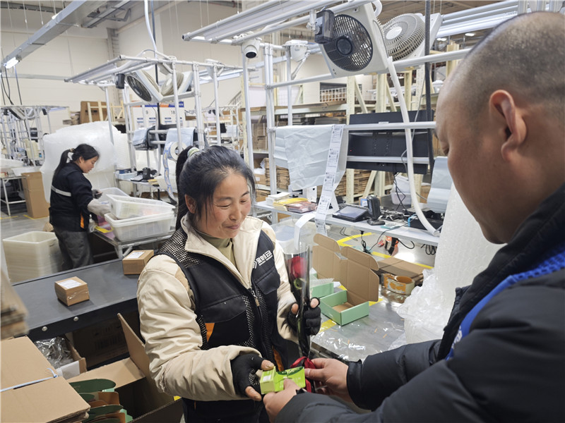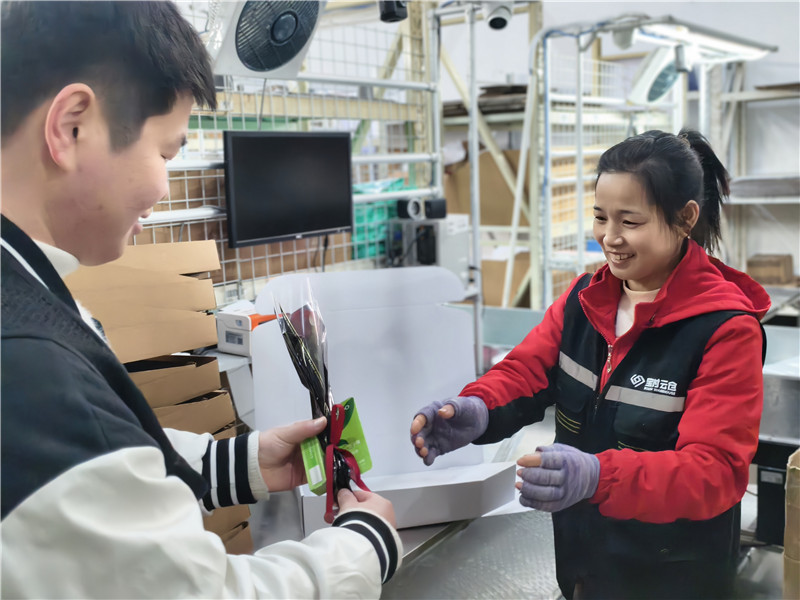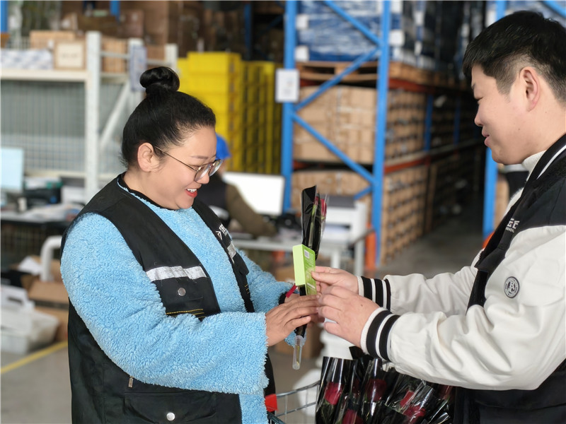 節(jié)日上午,人事行政部陳文娣和王雷推著滿載鮮花的花車,化身“送花使者”,帶著精心準(zhǔn)備的鮮花與小禮品,走進(jìn)總部辦公室和3個倉庫,將飽含謝意的花束送到每一位女性員工手中。